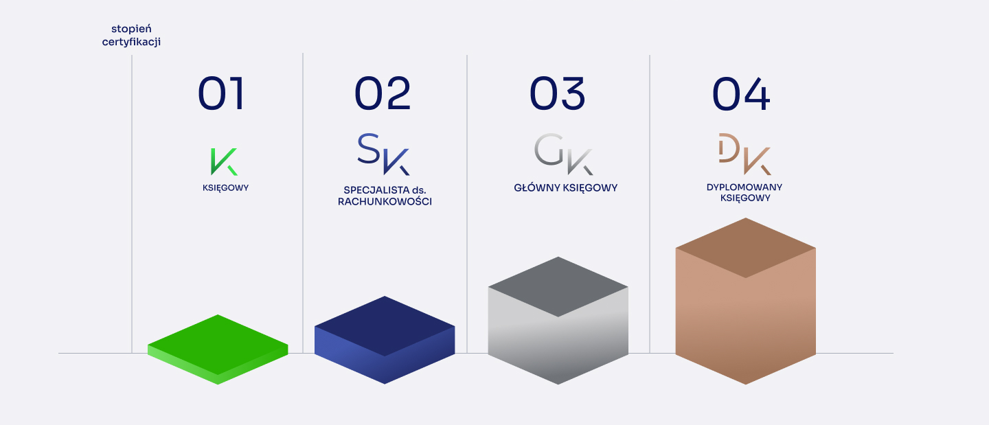 Stopnie I–IV: od księgowego do dyplomowanego księgowego.