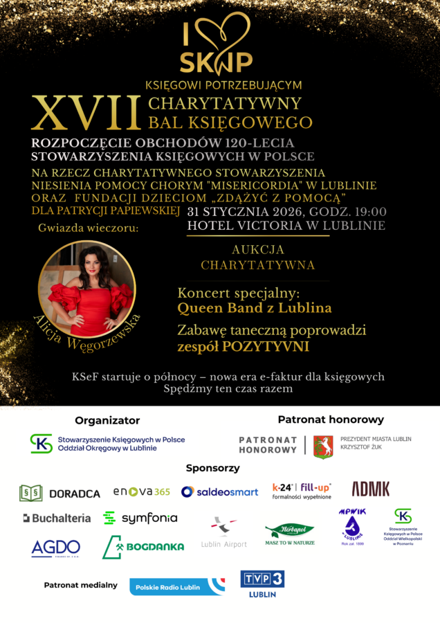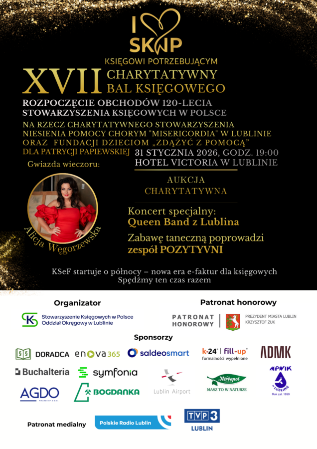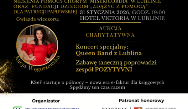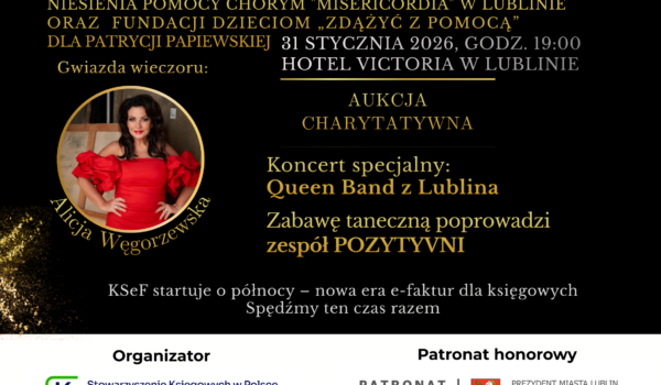 W Lublinie odbył się Charytatywny Bal Księgowego pod hasłem „Księgowi Potrzebującym”. Wydarzenie miało wyjątkowy charakter – nie tylko integracyjny, ale przede wszystkim pomocowy. Dochód z balu zostanie przeznaczony na leczenie Patrycji Papiewskiej, podopiecznej Fundacji „Zdążyć z Pomocą”, a także na wsparcie działalności Stowarzyszenia Niesienia Pomocy Chorym Misericordia.
