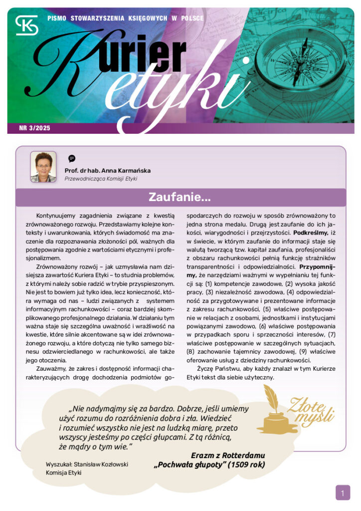 Pismo kierujemy do wszystkich osób zainteresowanych tematyką etyki w rachunkowości – zarówno doświadczonych profesjonalistów, jak i tych, którzy dopiero rozpoczynają swoją drogę zawodową. Kurier Etyki to narzędzie dialogu, edukacji i inspirowania do zmian w praktyce zawodowej.