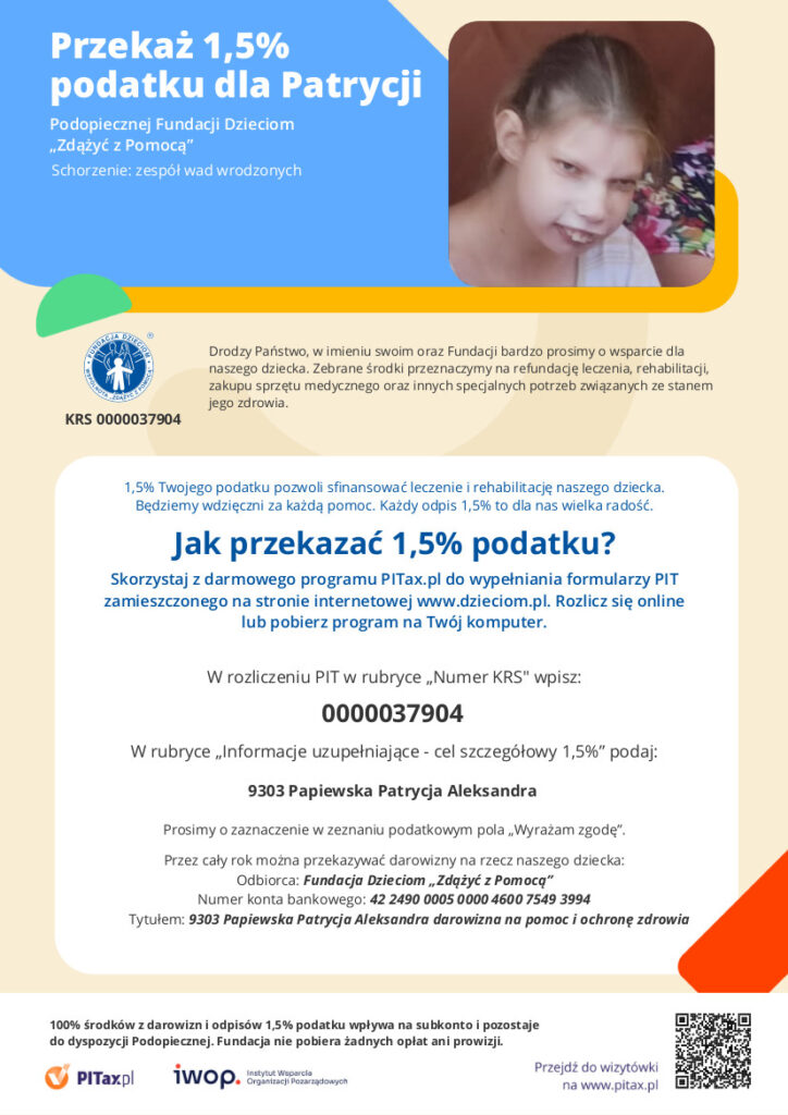 Prosimy Was o przekazanie 1,5% podatku PIT na Jej leczenie i rehabilitację. To nic nie kosztuje, a może zdziałać cuda!