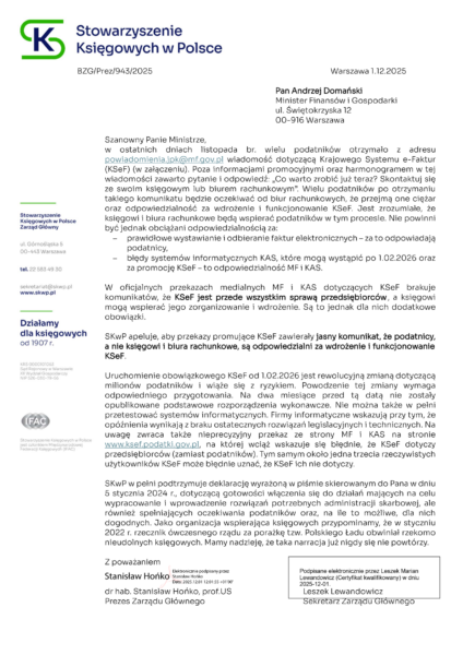 SKwP skierowało do Ministra Finansów pismo odnoszące się do wiadomości przesyłanych do podatników w ostatnich dniach listopada br., dotyczących Krajowego Systemu e-Faktur (KSeF).