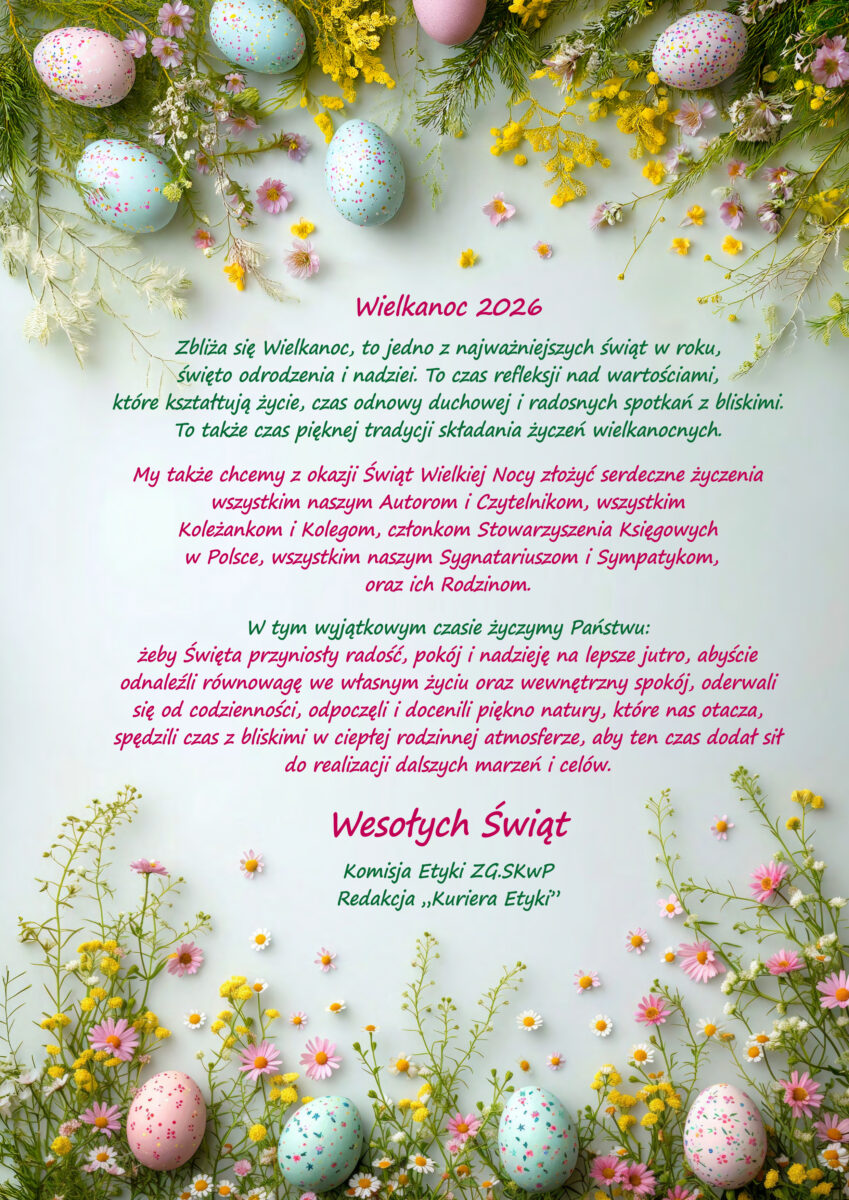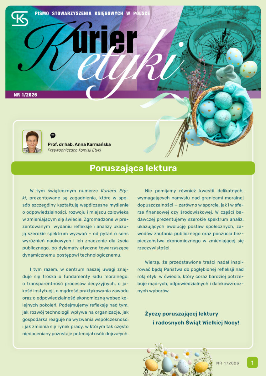 Zapraszamy do lektury najnowszego wydania, w którym podejmujemy ważne i aktualne tematy dotyczące odpowiedzialności, etyki oraz roli człowieka w dynamicznie zmieniającym się świecie. W numerze znajdą Państwo m.in. refleksje o wpływie technologii na biznes i rachunkowość, wyzwaniach współczesnej gospodarki oraz dylematach etycznych w różnych obszarach życia społecznego.
