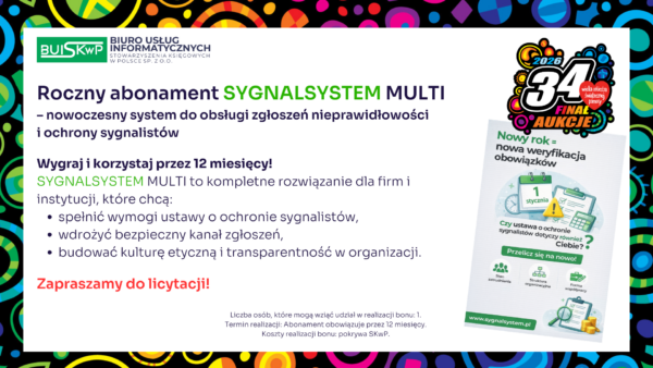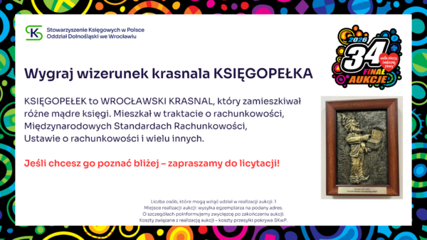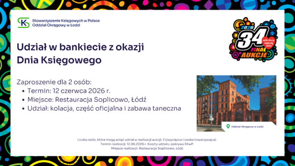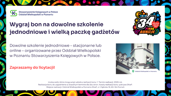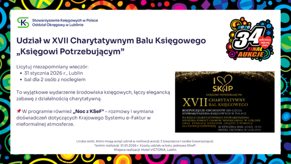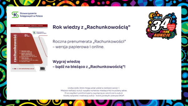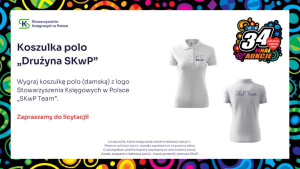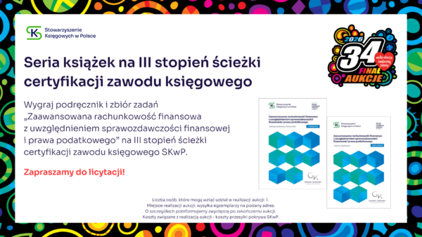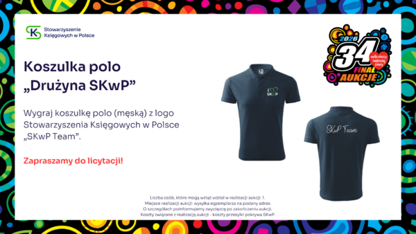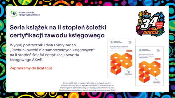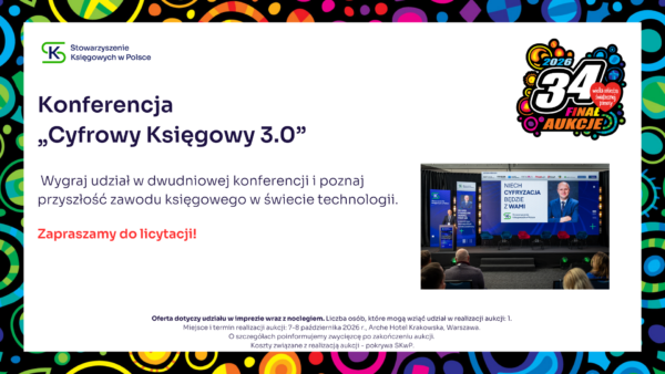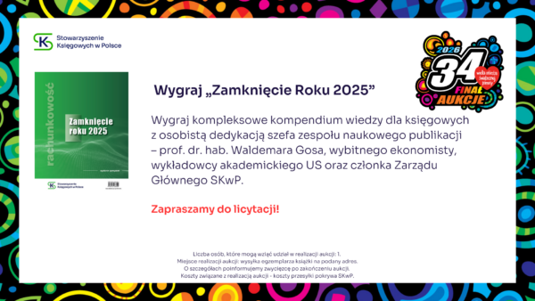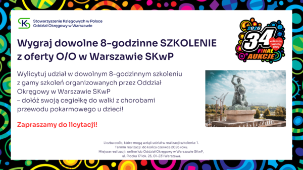Stowarzyszenie Księgowych w Polsce zaprasza do udziału w aukcji charytatywnej, z której cały dochód wesprze Wielką Orkiestrę Świątecznej Pomocy. Zapraszamy do licytacji! Udział w konferencji SKwP „Cyfrowy Księgowy 3.0” Zaproszenie dla 2 osób na Bal Charytatywny w Lublinie SKwP Widzimy się już 31. stycznia w Lublinie ❣️ Kurs SKwP Kadry i Płace ONLINE Zaproszenie na bankiet z okazji Dnia Księgowego w O/O w Łodzi SKwP Kurs I stopień certyfikacji zawodu księgowego SKwP Rozpoczęcie kursu już 7. lutego br. ❣️ Wygraj Bon na dowolne szkolenie jednodniowe w SKwP i wielką paczkę gadżetów Wygraj dowolne 8-godzinne SZKOLENIE z oferty O/O w Warszawie SKwP #1 Wygraj dowolne 8-godzinne SZKOLENIE z oferty O/O w Warszawie SKwP #2 Wygraj wizerunek krasnala KSIĘGOPEŁKA SKwP Roczny abonament SYGNALSYSTEM MULTI / BUI SKwP Rok wiedzy z miesięcznikiem „Rachunkowość” „Zamknięcie Roku 2025” z wyjątkową dedykacją Złota Seria Rachunkowości Polskiej – edycja kolekcjonerska Książki na I stopień certyfikacji SKwP – księgowy Książki na II stopień certyfikacji SKwP – specjalista ds. rachunkowości Książki na III stopień certyfikacji SKwP – główny księgowy Koszulka polo „Drużyna SKwP” (damska) Koszulka polo „Drużyna SKwP” (męska)