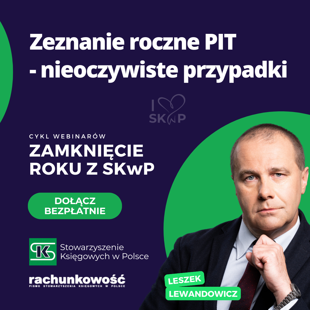 📢 Webinar poprowadzi Leszek Lewandowicz – doradca podatkowy, wieloletni wykładowca SKwP, Sekretarz Zarządu Głównego SKwP oraz Oddziału Wielkopolskiego. To gwarancja merytoryki i praktycznych przykładów.