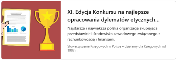Z radością informujemy, że zakończyliśmy XI. Edycję Konkursu na najlepsze opracowania dylematów etycznych, którego celem było promowanie refleksji nad etyką zawodową i praktycznym stosowaniem wartości w pracy. Inspirujące i różnorodne opracowania oceniała Kapituła Konkursu pod kątem: trafności identyfikacji dylematu oraz formuły jego analizy zgodnej z zasadami etyki.