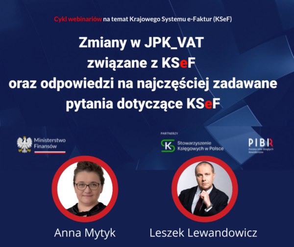 Ministerstwo Finansów we współpracy ze Stowarzyszenie Księgowych w Polsce Zarząd Główny oraz Polska Izba Biegłych Rewidentów zaprasza na bezpłatny cykl webinariów poświęconych Krajowemu Systemowi e-Faktur (KSeF). Rejestracja na kolejne spotkanie z tego cyklu zatytułowane „Zmiany w JPK_VAT związane z KSeF oraz odpowiedzi na najczęściej zadawane pytania dotyczące KSeF" dostępna jest w grafice poniżej.