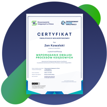 Ukończenie kursu w ramach ścieżki certyfikacji SKwP to podwójna korzyść. Uczestnik, który pomyślnie zakończy naukę, otrzymuje zarówno certyfikat Stowarzyszenia Księgowych w Polsce, potwierdzający zdobycie kwalifikacji zgodnych z krajowym standardem SKwP, jak i dokument uznawany w Zintegrowanym Systemie Kwalifikacji (ZSK). To wyjątkowe połączenie gwarantuje uznanie kompetencji w środowisku zawodowym, zwiększa wiarygodność i realnie wzmacnia pozycję na rynku pracy.